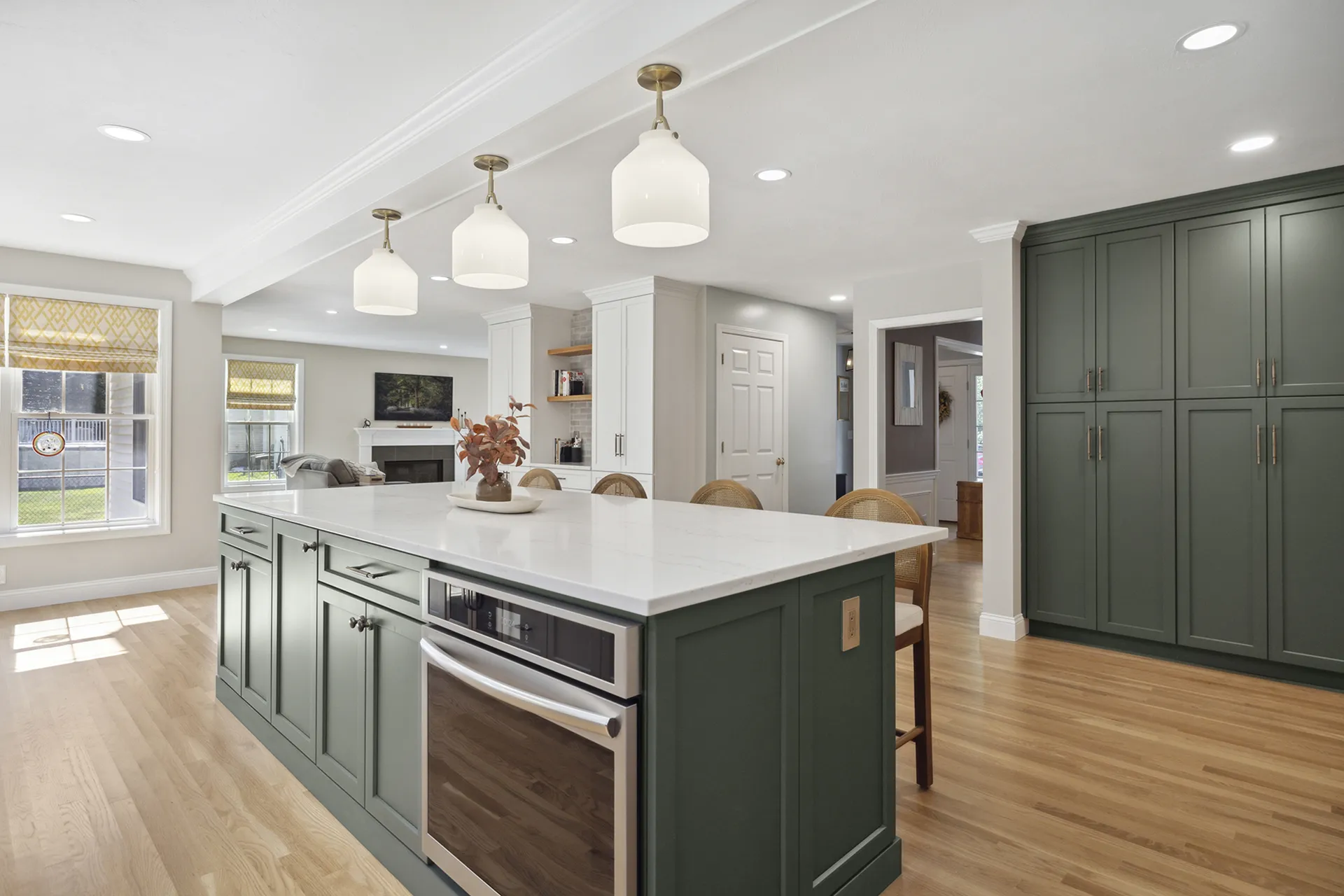 This kitchen renovation in Nashua, NH included a single-story addition and full interior reconfiguration to improve flow, sightlines, and usable space. Semi-custom cabinetry, durable finishes, and new natural light sources were incorporated to enhance both storage and usability. The open layout was precisely planned to accommodate cooking, gathering, and day-to-day activity without congestion or visual clutter.
