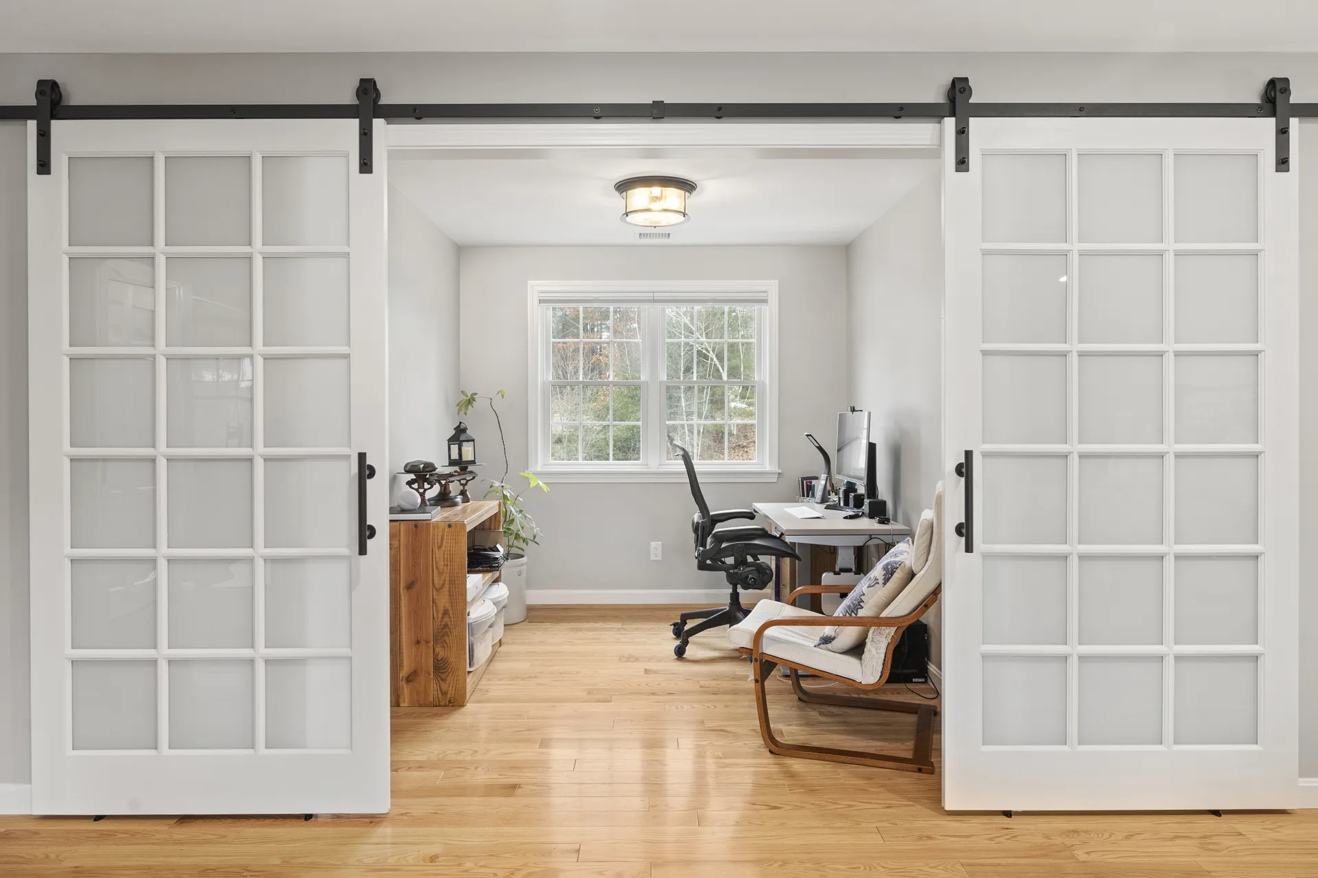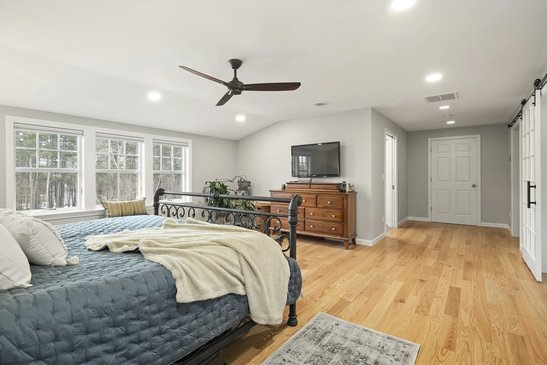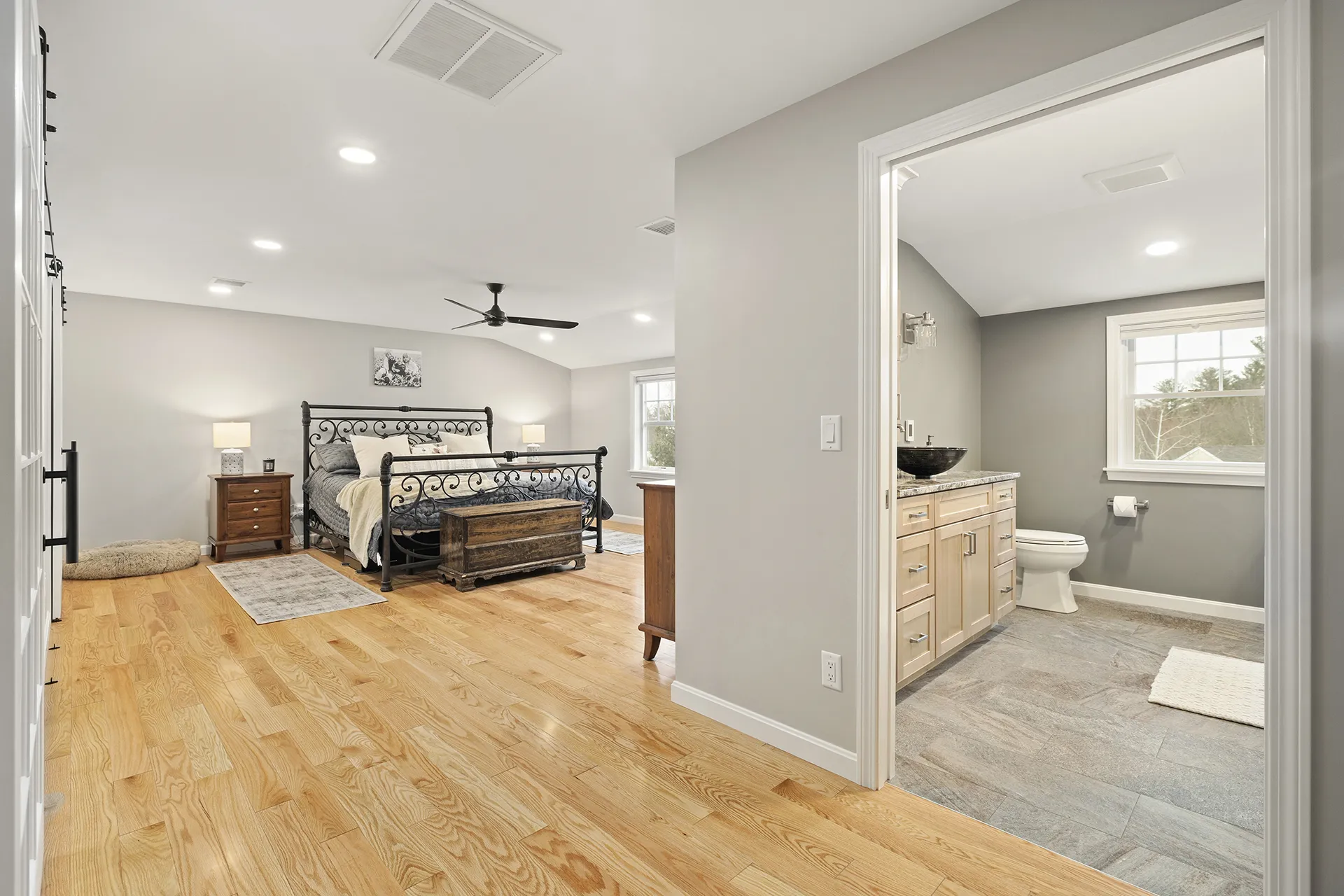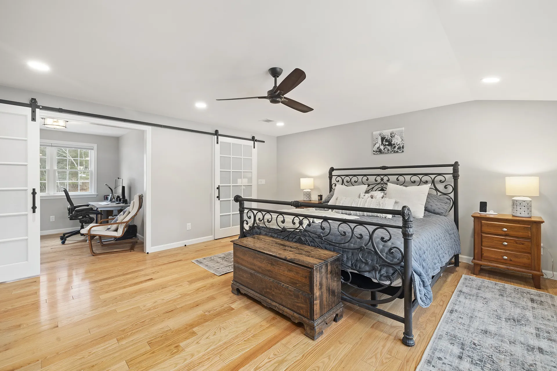 This addition transformed an underutilized attic above the garage into a spacious master suite. A carefully planned dormer brought in natural light, while thoughtful layout adjustments created separate zones for sleeping, working, and dressing. Features include large windows, recessed lighting, barn doors, his-and-her closets, and an adjoining private bathroom—each element designed for comfort, elegance, and day-to-day usability.